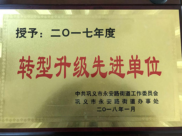 热烈祝贺我公司荣获巩义市永安街道办工业园区2017年度“转型升级先进单位”、“纳税大户”光荣称号,公司董事长董新获得“先进工作者”光荣称号!